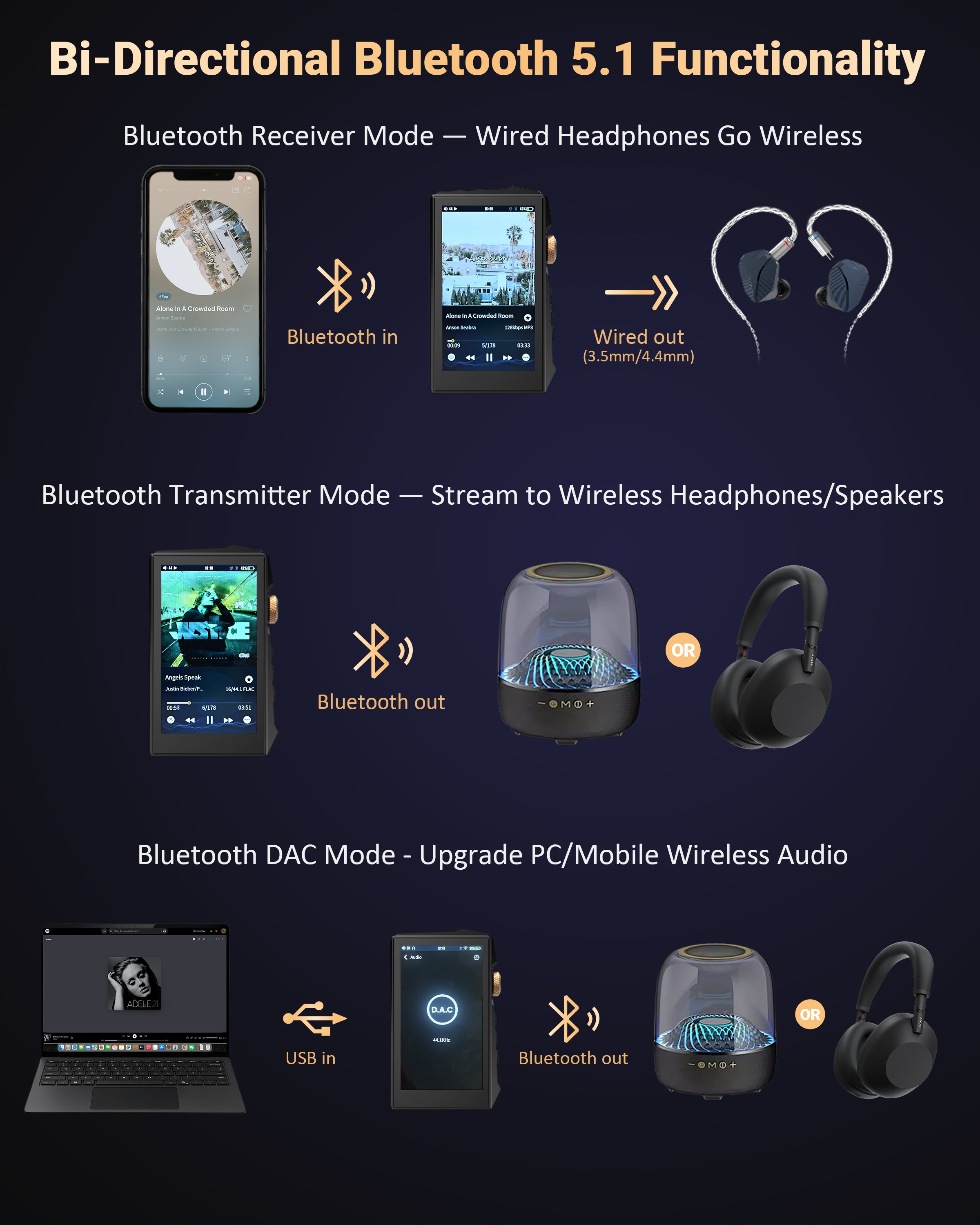 Powered by the new X1600E SoC, AP80 PRO MAX delivers a significant boost in processing speed, ensuring ultra-smooth interactions. Bluetooth connectivity has been further optimized for faster, more stable wireless transmission—whether connecting wireless headphones, Bluetooth speakers, or functioning as a USB DAC, stable and reliable audio performance is guaranteed.