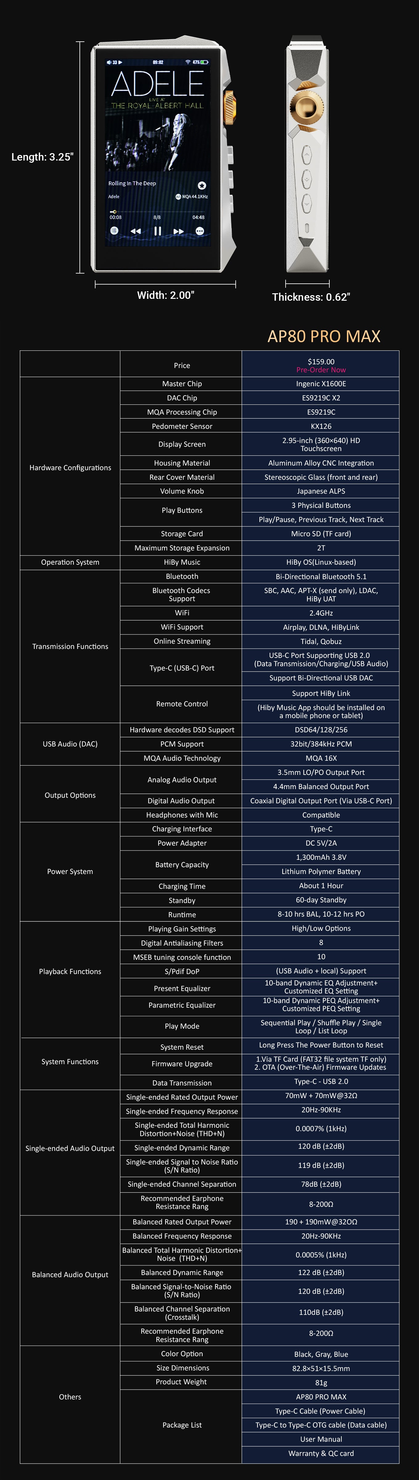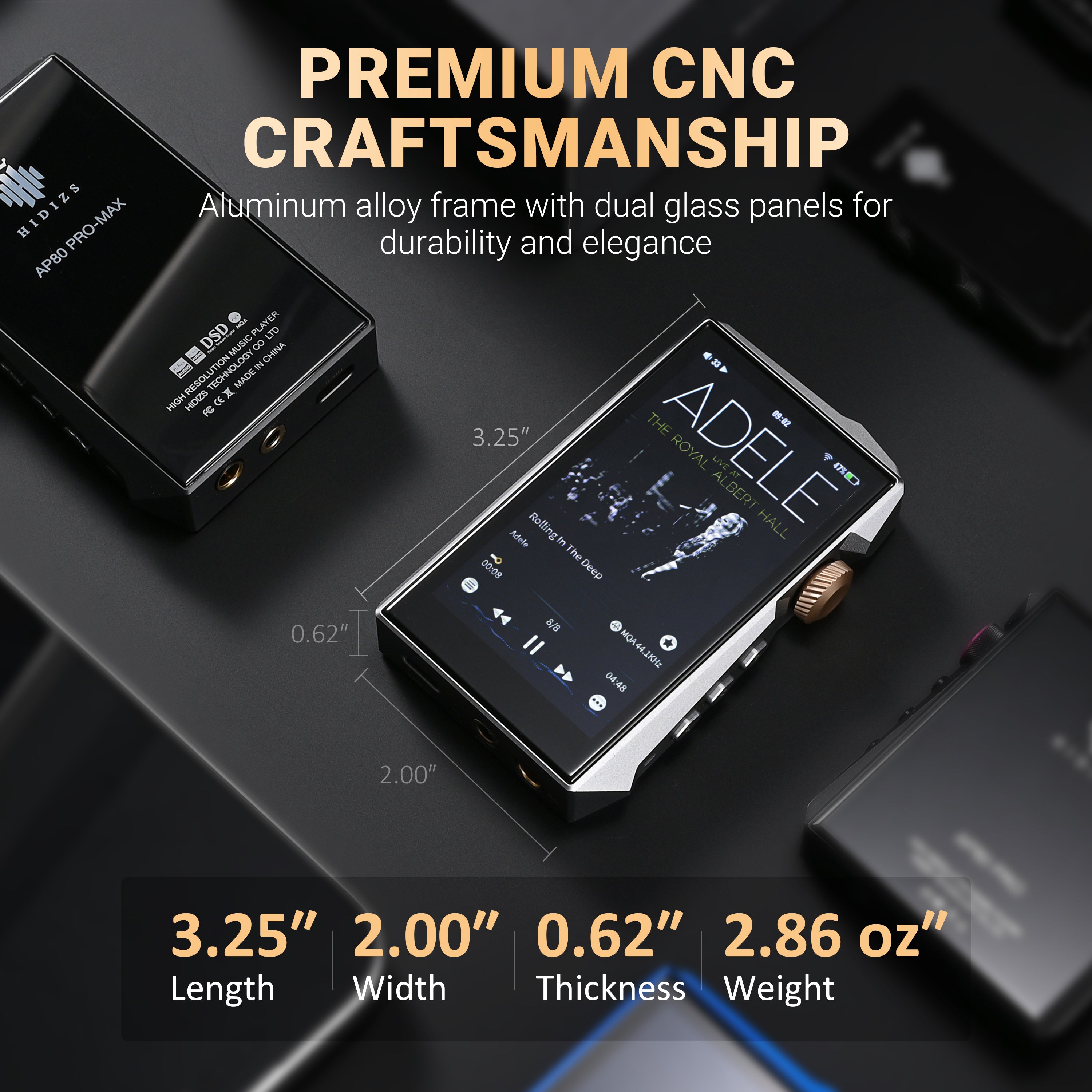 The HIDIZS AP80 PRO MAX delivers studio-quality sound in a compact, pocket-sized design. Enjoy lossless microSD playback, bidirectional Bluetooth 5.1, and 2.4GHz Wi-Fi streaming for Tidal, Qobuz, DLNA & AirPlay — all in one device.
