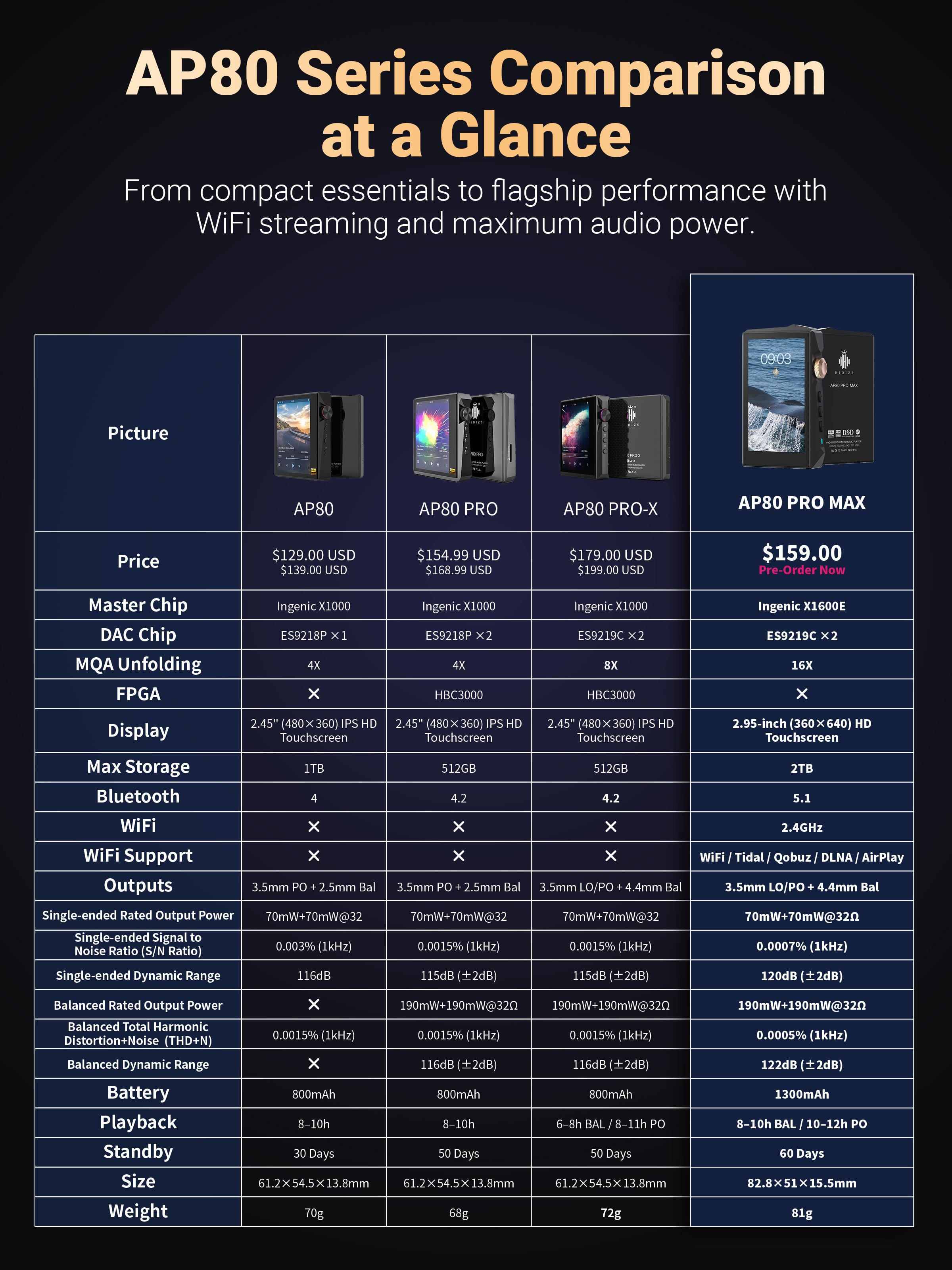 The AP80 PRO MAX remains the same compact, all-in-one Hi-Fi music player — delivering studio-grade sound and seamless streaming in a sleek, pocket-sized design.