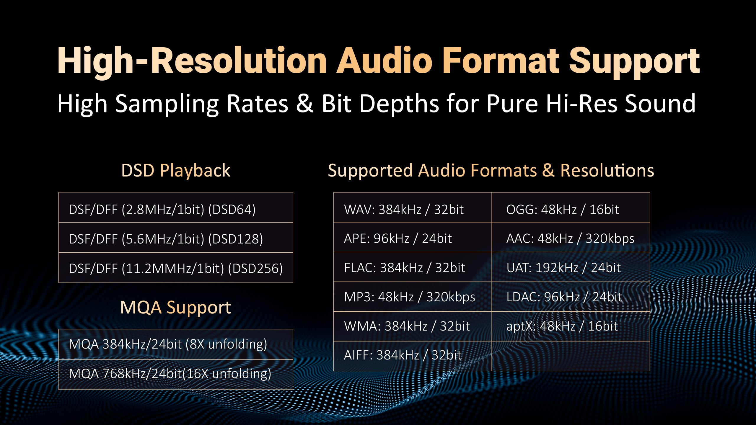 Supporting DSD256 and PCM 384kHz/32bit, the AP80 PRO MAX reproduces studio-grade resolution far beyond CD quality. Enjoy authentic and mmersive Hi-Fi experience across genres, lifelike sound across all lossless formats—from FLAC and WAV to ALAC and DSD.