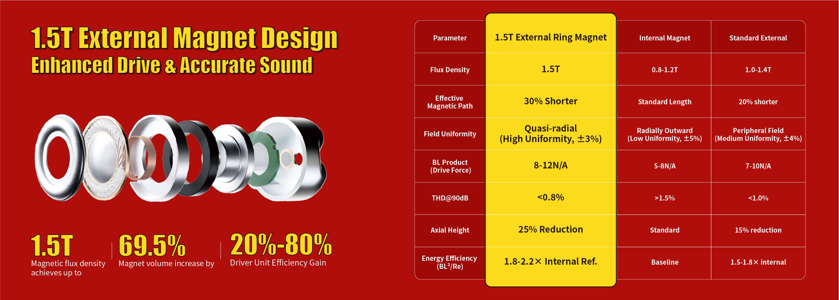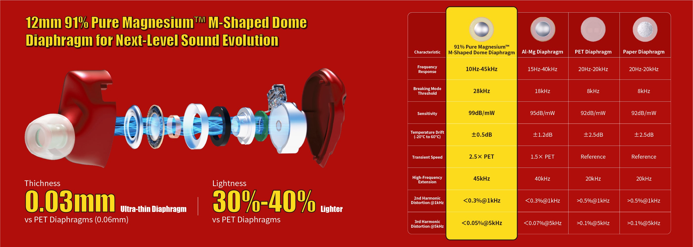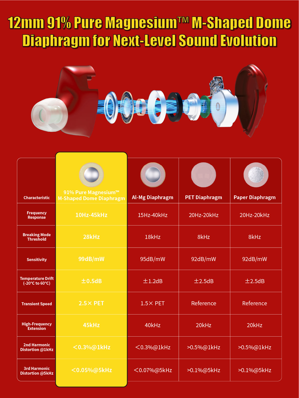 Next-Gen HiFi Performance: 12mm 91% Pure Magnesium Diaphragm & 1.5T Magnetic Circuit