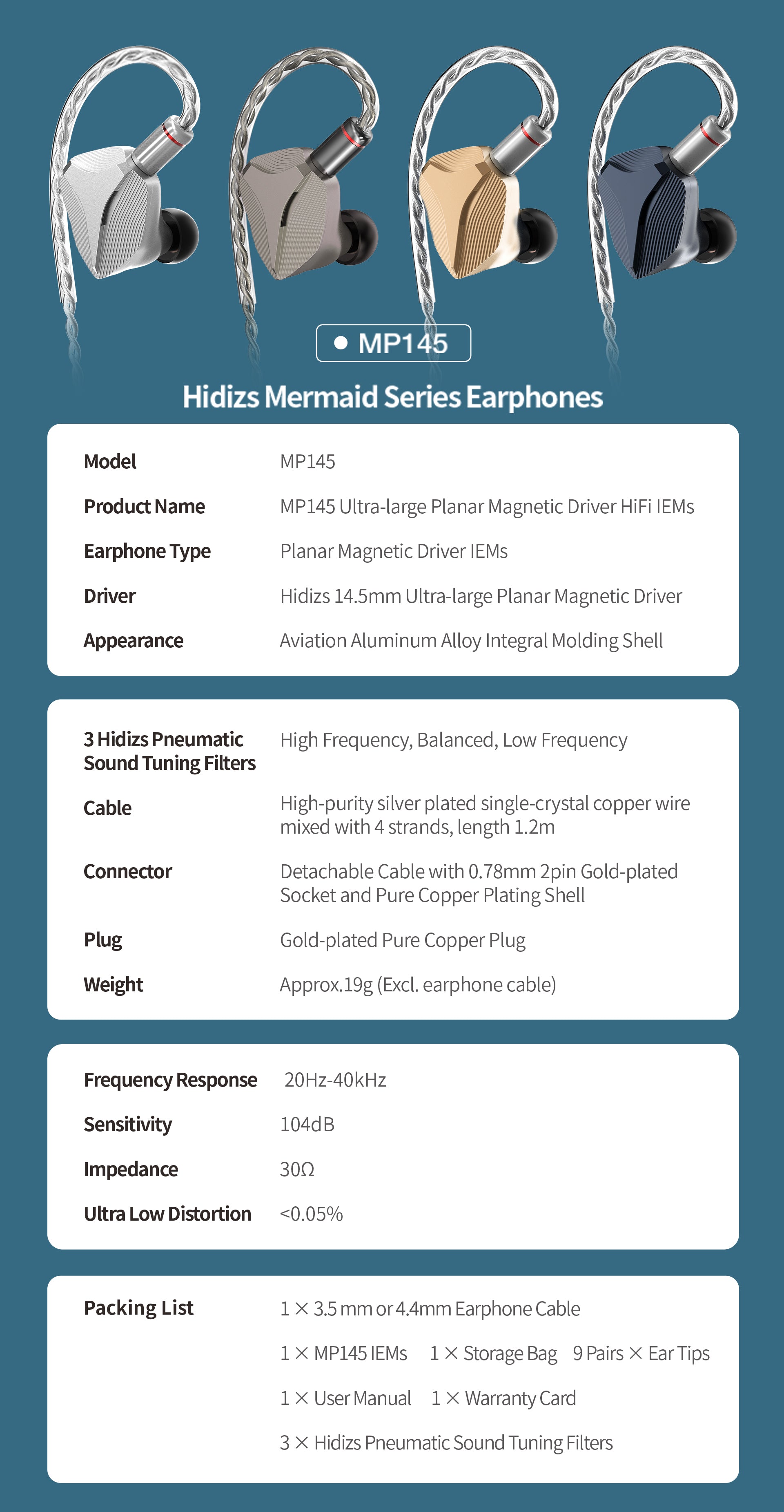 Equipped with a signal cable crafted from a blend of four strands of 99.9999% high-purity single-crystal oxygen-free copper silver-plated wire, the MP145 ensures a amorphous low-resistance and high-tensile listening experience.
