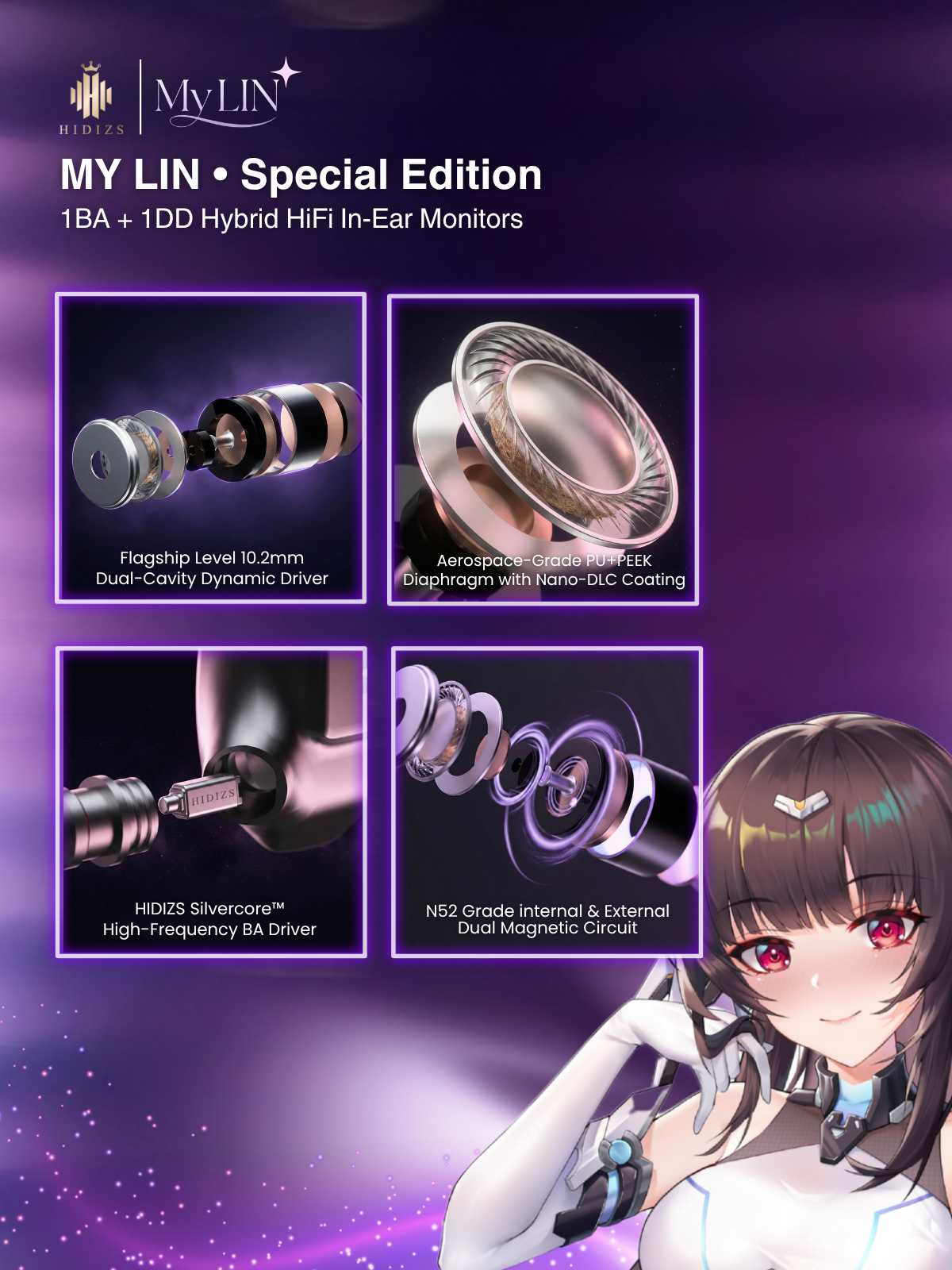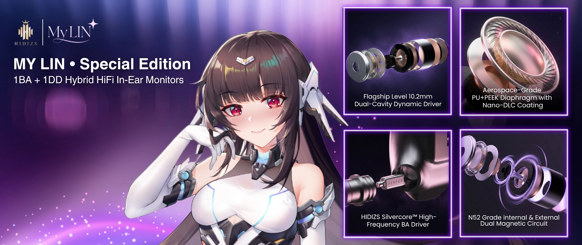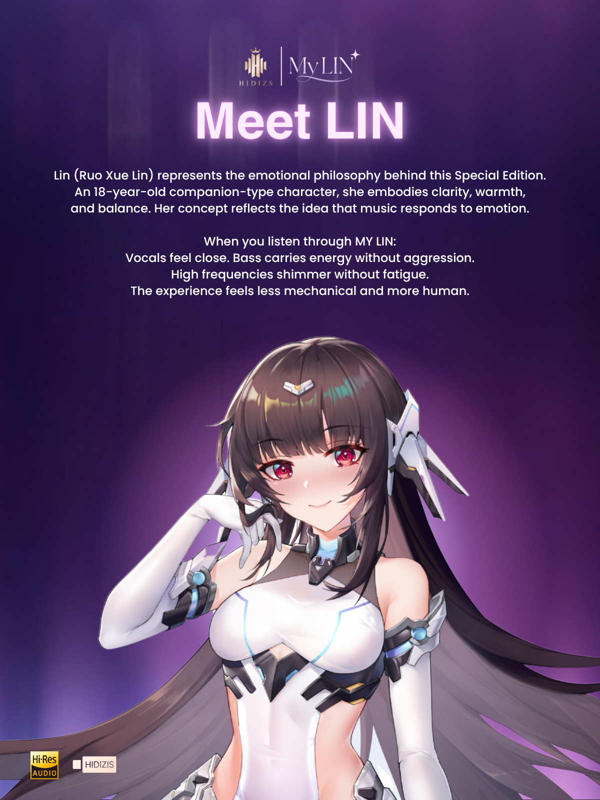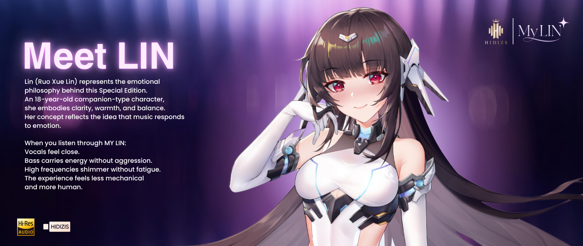 Lin (Ruo Xue Lin) is the emotional embodiment of the MY LIN Special Edition. Created as an original HIDIZS character, she represents the philosophy behind this tuning — clarity with warmth, precision with balance.