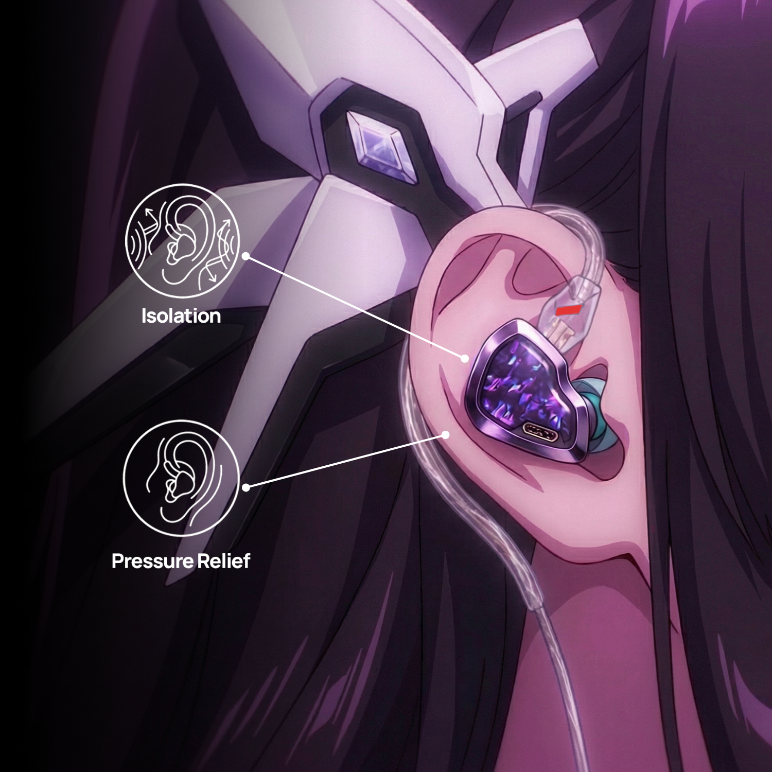 The ZA12 Zinc Alloy Shell provides structural density and acoustic stability, while the carbon fiber faceplate enhances durability and adds visual depth. The ergonomic design, based on extensive ear mold data, ensures a secure fit, and the integrated pneumatic pressure relief system reduces discomfort from pressure buildup. With multiple silicone ear tips included, achieving a proper seal and up to 20dB passive isolation is effortless, keeping comfort stable and the fit secure for an immersive listening experience.