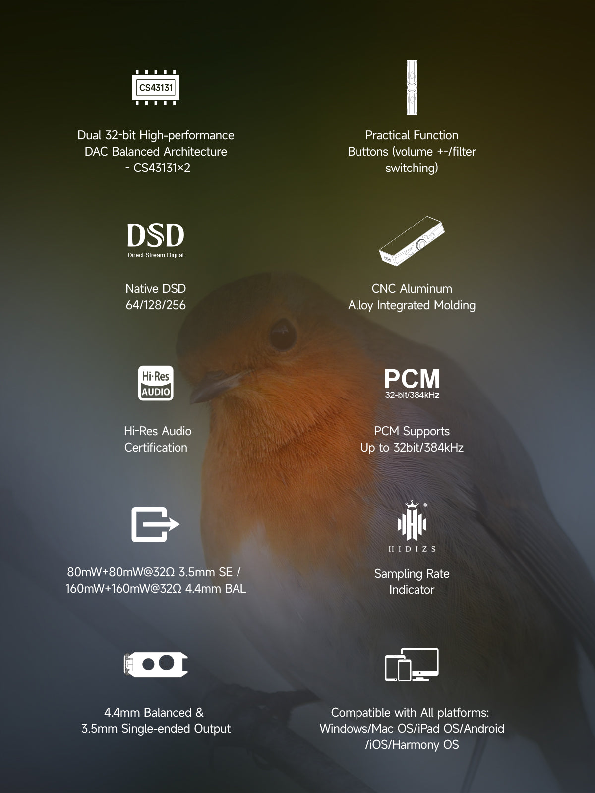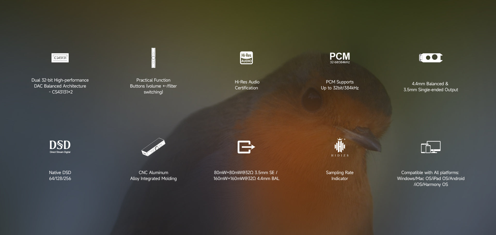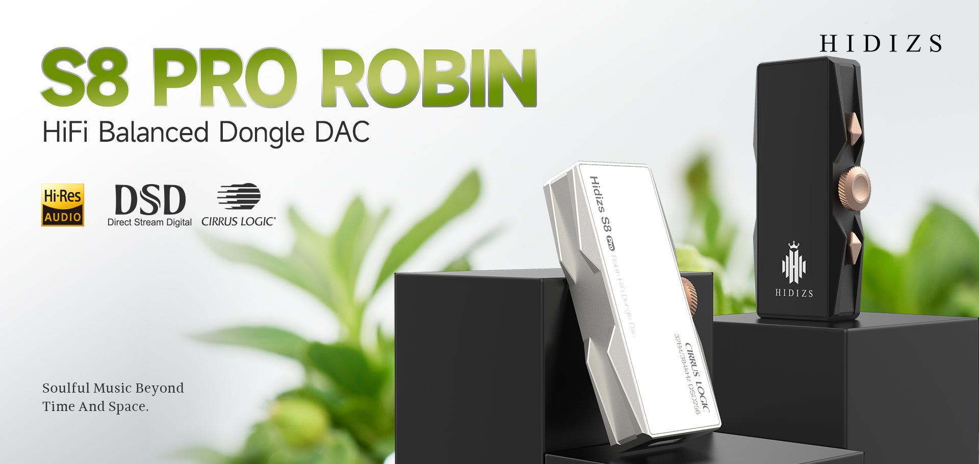 HIDIZS S8 Pro Robin is a new model upgraded from the previous generation S8 DAC dongle. The Hidizs S8 Pro Robin boasts a dual 32-bit DAC balanced architecture, powered by two CS43131 chips from CIRRUS LOGIC®. The single-ended output power is up to 80mW+80mW@32Ω, and the balanced port thrust is increased to 160mW+160mW@32Ω. Its excellent performance is highly praised by audiophiles.