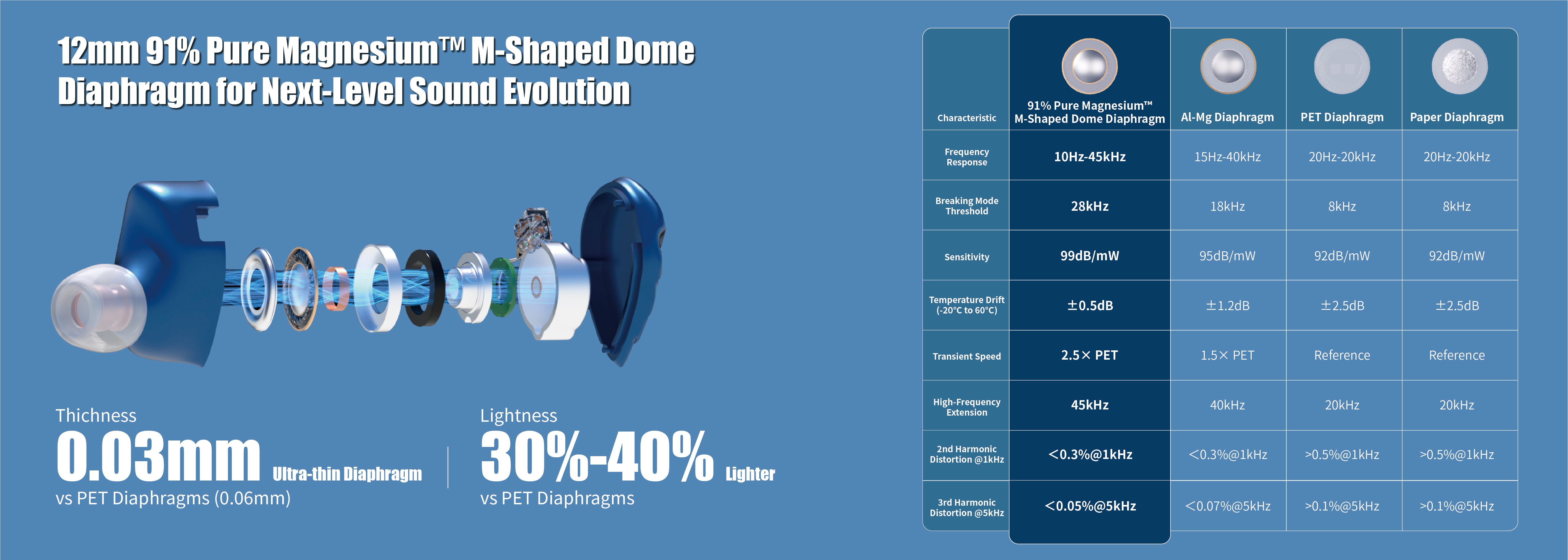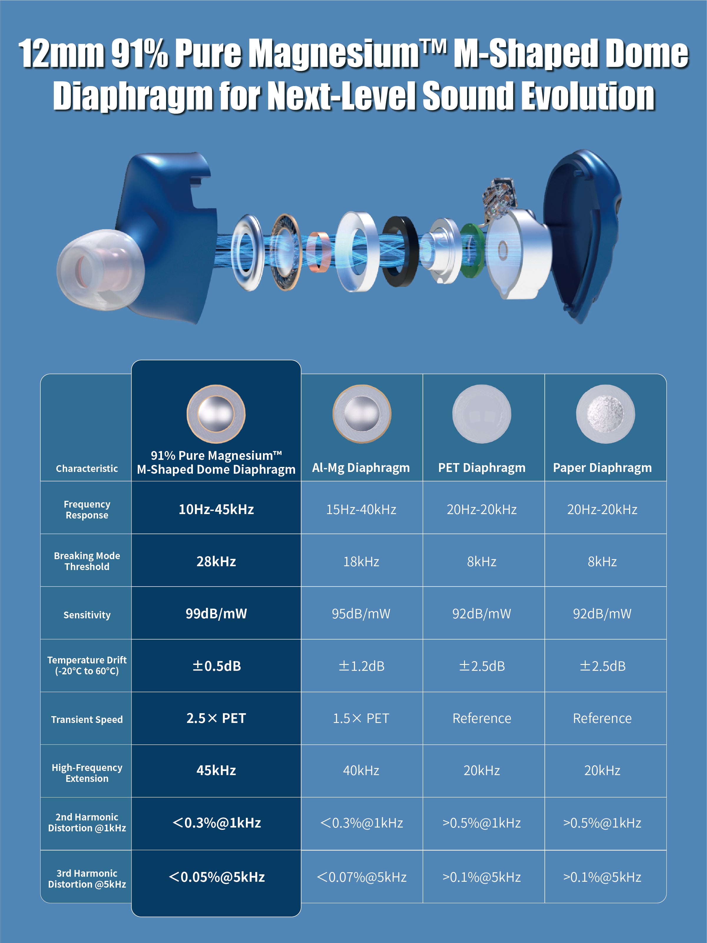 Next-Gen HiFi Performance: 12mm 91% Pure Magnesium Diaphragm & 1.5T Magnetic Circuit